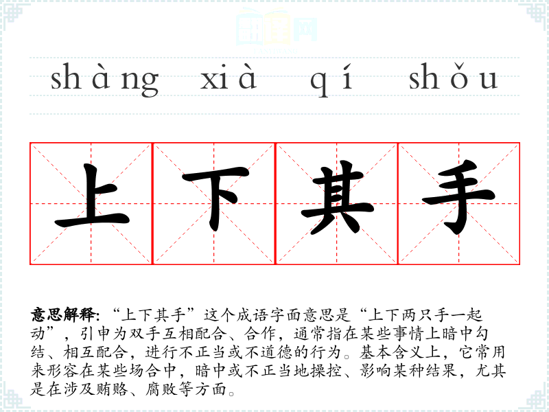 “上下其手”这个成语字面意思是“上下两只手一起动”,引申为双手互相配合、合作,通常指在某些事情上暗中勾结、相互配合,进行不正当或不道德的行为。基本含义上,它常用来形容在某些场合中,暗中或不正当地操控、影响某种结果,尤其是在涉及贿赂、腐败等方面。