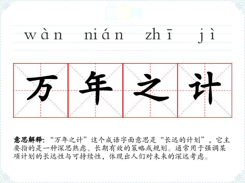 “万年之计”这个成语字面意思是“长远的计划”,它主要指的是一种深思熟虑、长期有效的策略或规划。通常用于强调某项计划的长远性与可持续性,体现出人们对未来的深远考虑。