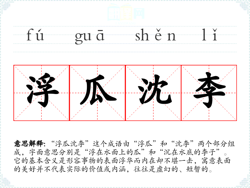 “浮瓜沈李”这个成语由“浮瓜”和“沈李”两个部分组成,字面意思分别是“浮在水面上的瓜”和“沉在水底的李子”。它的基本含义是形容事物的表面浮华而内在却不堪一击,寓意表面的美好并不代表实际的价值或内涵,往往是虚幻的、短暂的。