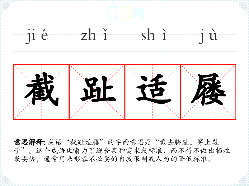 成语“截趾适屦”的字面意思是“截去脚趾,穿上鞋子”。这个成语比喻为了迎合某种需求或标准,而不得不做出牺牲或妥协,通常用来形容不必要的自我限制或人为的降低标准。