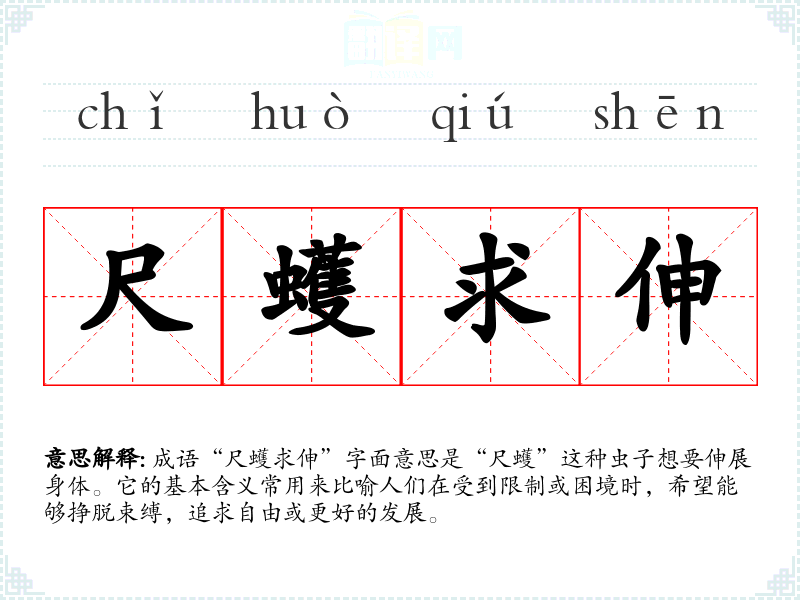 成语“尺蠖求伸”字面意思是“尺蠖”这种虫子想要伸展身体。它的基本含义常用来比喻人们在受到限制或困境时,希望能够挣脱束缚,追求自由或更好的发展。