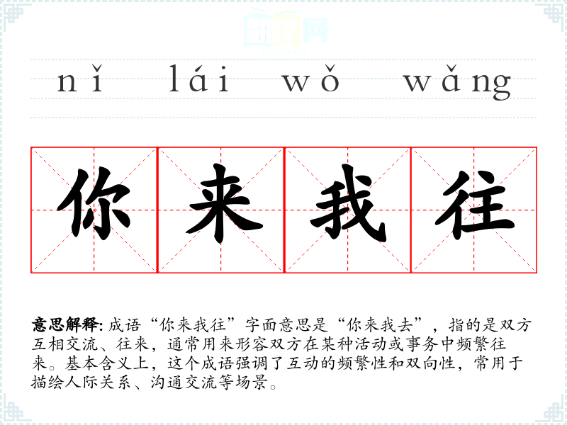 成语“你来我往”字面意思是“你来我去”,指的是双方互相交流、往来,通常用来形容双方在某种活动或事务中频繁往来。基本含义上,这个成语强调了互动的频繁性和双向性,常用于描绘人际关系、沟通交流等场景。
