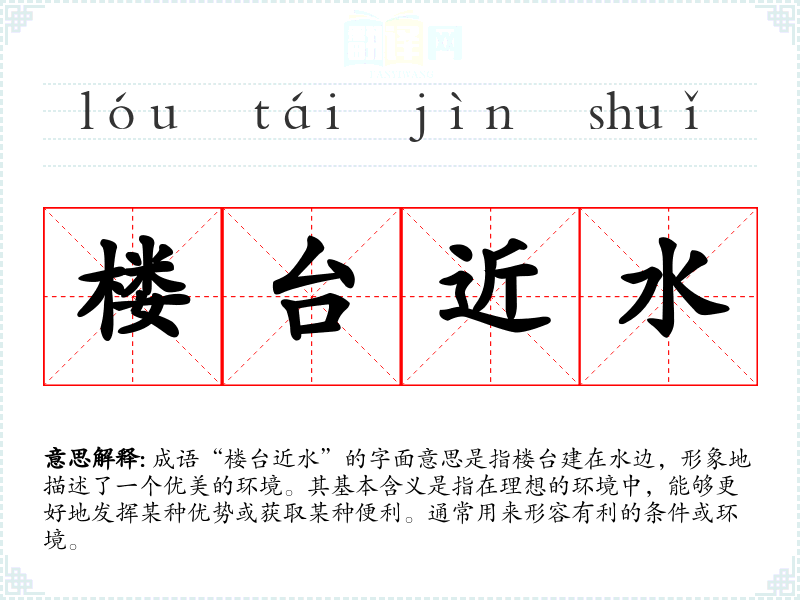 成语“楼台近水”的字面意思是指楼台建在水边,形象地描述了一个优美的环境。其基本含义是指在理想的环境中,能够更好地发挥某种优势或获取某种便利。通常用来形容有利的条件或环境。