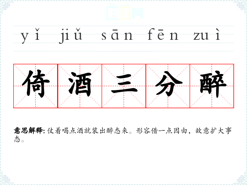 | 倚酒三分醉 | 仗着喝点酒就装出醉态来。形容借一点因由,故意扩大事态。 |