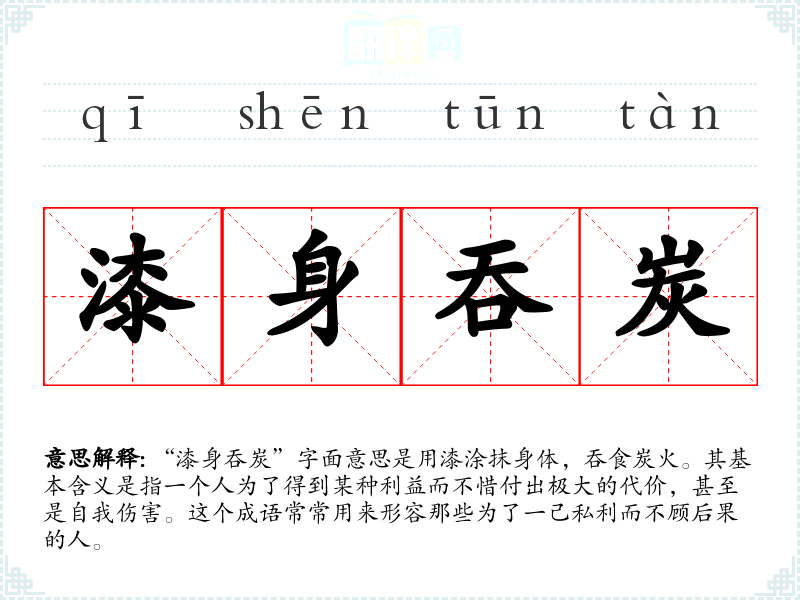 “漆身吞炭”字面意思是用漆涂抹身体,吞食炭火。其基本含义是指一个人为了得到某种利益而不惜付出极大的代价,甚至是自我伤害。这个成语常常用来形容那些为了一己私利而不顾后果的人。
