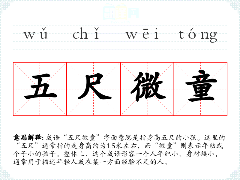 成语“五尺微童”字面意思是指身高五尺的小孩。这里的“五尺”通常指的是身高约为1.5米左右,而“微童”则表示年幼或个子小的孩子。整体上,这个成语形容一个人年纪小、身材矮小,通常用于描述年轻人或在某一方面经验不足的人。