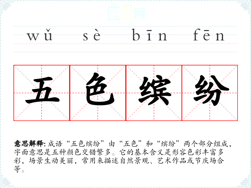 | 五彩缤纷 | 五彩:各种颜色;缤纷:繁多交错的样子。指颜色繁多,非常好看。 |