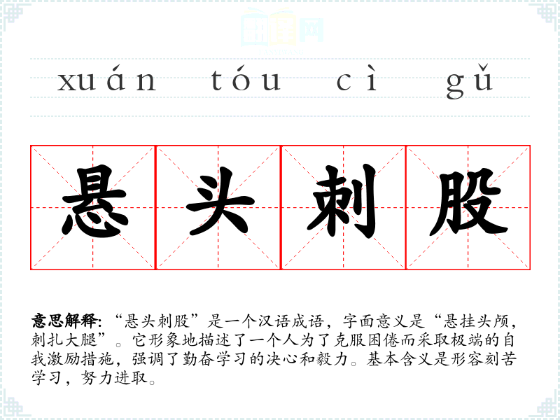 “悬头刺股”是一个汉语成语,字面意义是“悬挂头颅,刺扎大腿”。它形象地描述了一个人为了克服困倦而采取极端的自我激励措施,强调了勤奋学的决心和毅力。基本含义是形容刻苦学,努力进取。