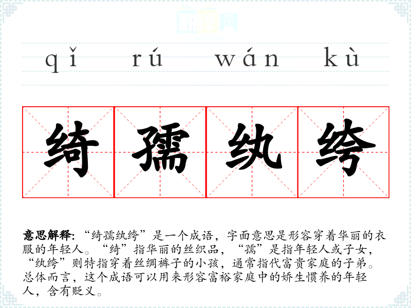“绮孺纨绔”是一个成语,字面意思是形容穿着华丽的衣服的年轻人。“绮”指华丽的丝织品,“孺”是指年轻人或子女,“纨绔”则特指穿着丝绸裤子的小孩,通常指代富贵家庭的子弟。总体而言,这个成语可以用来形容富裕家庭中的娇生惯养的年轻人,含有贬义。