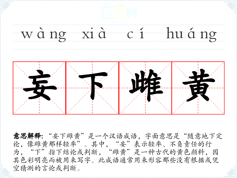 “妄下雌黄”是一个汉语成语,字面意思是“随意地下定论,像雌黄那样轻率”。其中,“妄”表示轻率、不负责任的行为,“下”指下结论或判断,“雌黄”是一种古代的黄色颜料,因其色彩明亮而被用来写字。此成语通常用来形容那些没有根据或凭空猜测的言论或判断。