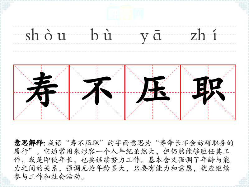 成语“寿不压职”的字面意思为“寿命长不会妨碍职务的履行”。它通常用来形容一个人年纪虽然大,但仍然能够胜任其工作,或是即使年长,也要继续努力工作。基本含义强调了年龄与能力之间的关系,强调无论年龄多大,只要有能力和意愿,就应继续参与工作和社会活动。