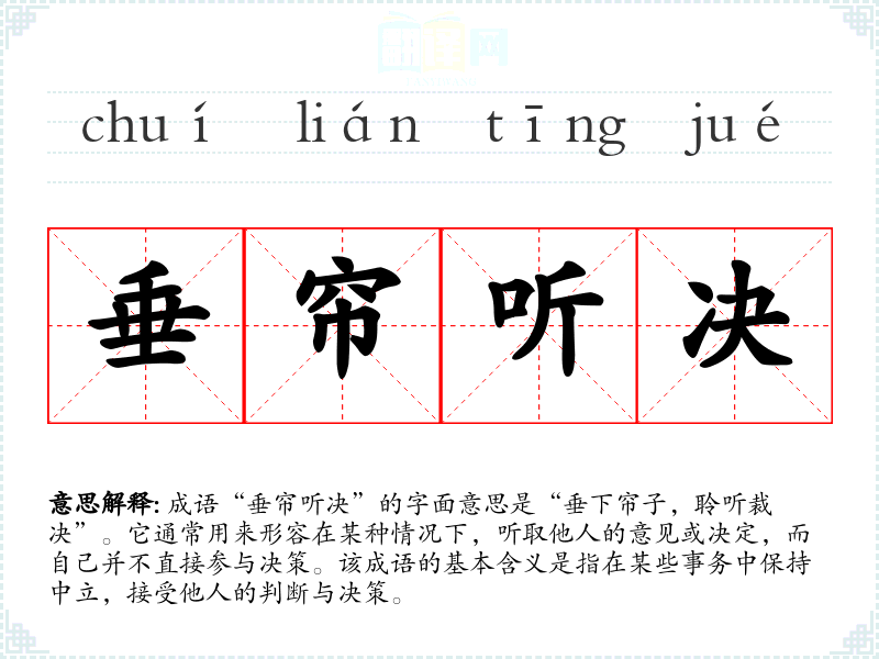 成语“垂帘听决”的字面意思是“垂下帘子,聆听裁决”。它通常用来形容在某种情况下,听取他人的意见或决定,而自己并不直接参与决策。该成语的基本含义是指在某些事务中保持中立,接受他人的判断与决策。