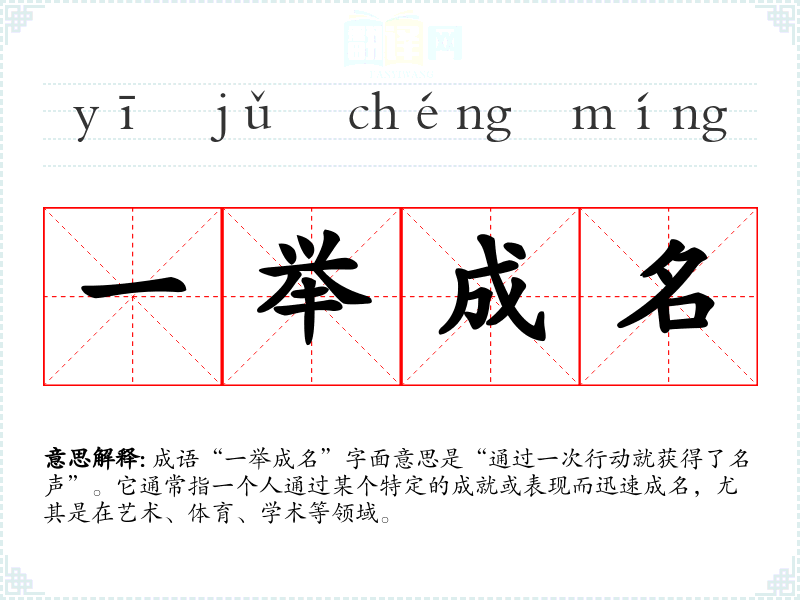 成语“一举成名”字面意思是“通过一次行动就获得了名声”。它通常指一个人通过某个特定的成就或表现而迅速成名,尤其是在艺术、体育、学术等领域。