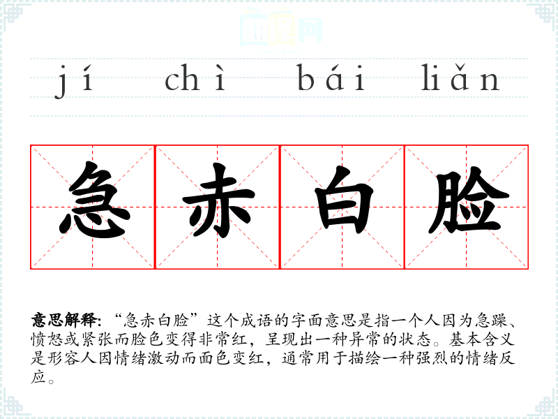 “急赤白脸”这个成语的字面意思是指一个人因为急躁、愤怒或紧张而脸色变得非常红,呈现出一种异常的状态。基本含义是形容人因情绪激动而面色变红,通常用于描绘一种强烈的情绪反应。
