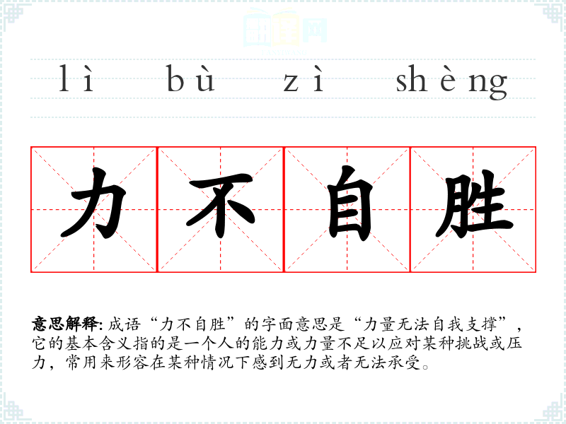 成语“力不自胜”的字面意思是“力量无法自我支撑”,它的基本含义指的是一个人的能力或力量不足以应对某种挑战或压力,常用来形容在某种情况下感到无力或者无法承受。