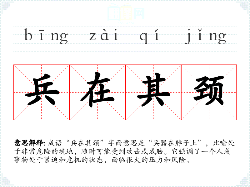 成语“兵在其颈”字面意思是“兵器在脖子上”,比喻处于非常危险的境地,随时可能受到攻击或威胁。它强调了一个人或事物处于紧迫和危机的状态,面临很大的压力和风险。