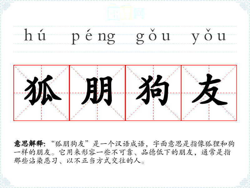 “狐朋狗友”是一个汉语成语,字面意思是指像狐狸和狗一样的朋友。它用来形容一些不可靠、品德低下的朋友,通常是指那些沾染恶*、以不正当方式交往的人。