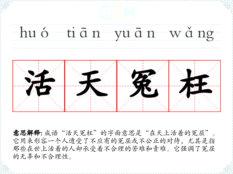成语“活天冤枉”的字面意思是“在天上活着的冤屈”。它用来形容一个人遭受了不应有的冤屈或不公正的对待,尤其是指那些在世上活着的人却承受着不合理的苦难和责难。它强调了冤屈的无辜和不合理性。