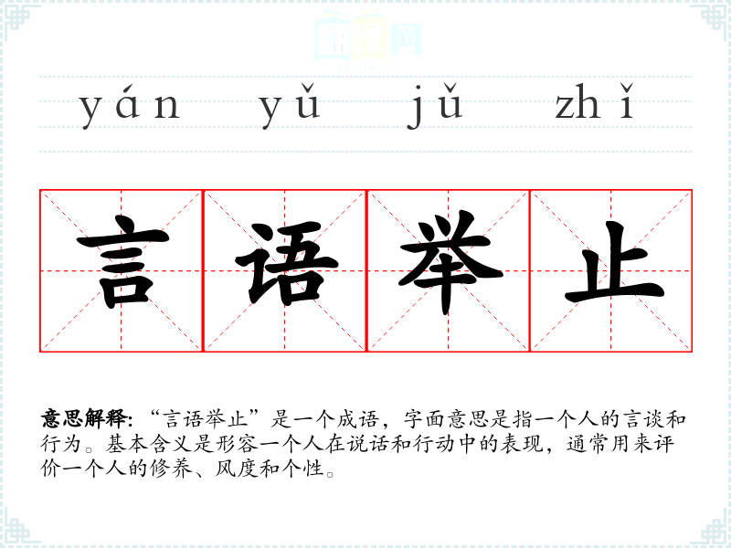 “言语举止”是一个成语,字面意思是指一个人的言谈和行为。基本含义是形容一个人在说话和行动中的表现,通常用来评价一个人的修养、风度和个性。