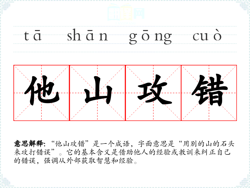 “他山攻错”是一个成语,字面意思是“用别的山的石头来攻打错误”。它的基本含义是借助他人的经验或教训来纠正自己的错误,强调从外部获取智慧和经验。