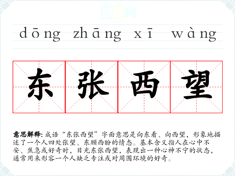 在**文化中,成语常常反映了人们对生活的观察和理解。“东张西望”体现了人们在面对不确定性时的自然反应,这种心理状态在现代社会中依然普遍存在,尤其是在快节奏的生活中,人们常常在忙碌中感到焦虑,表现出四处张望的心态。