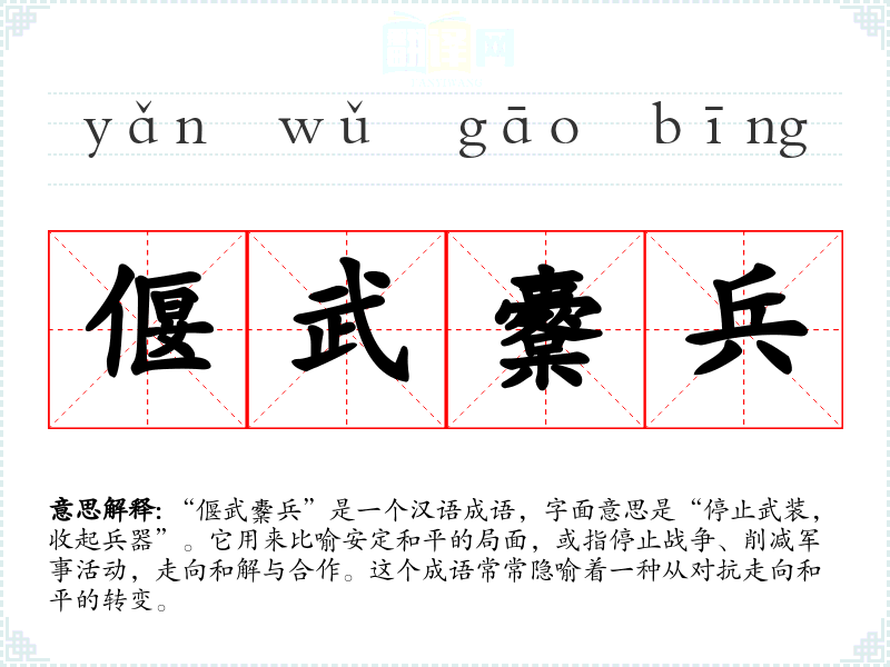 “偃武櫜兵”是一个汉语成语,字面意思是“停止武装,收起兵器”。它用来比喻安定和平的局面,或指停止战争、削减军事活动,走向和解与合作。这个成语常常隐喻着一种从对抗走向和平的转变。