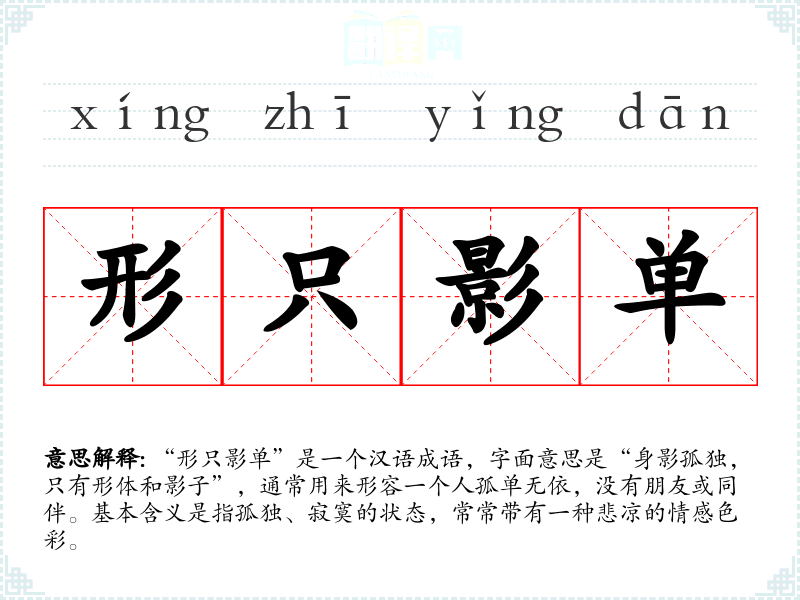 “形只影单”是一个汉语成语,字面意思是“身影孤独,只有形体和影子”,通常用来形容一个人孤单无依,没有朋友或同伴。基本含义是指孤独、寂寞的状态,常常带有一种悲凉的情感色彩。