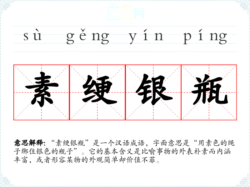 “素绠银瓶”是一个汉语成语,字面意思是“用素色的绳子绑住银色的瓶子”。它的基本含义是比喻事物的外表朴素而内涵丰富,或者形容某物的外观简单却价值不菲。