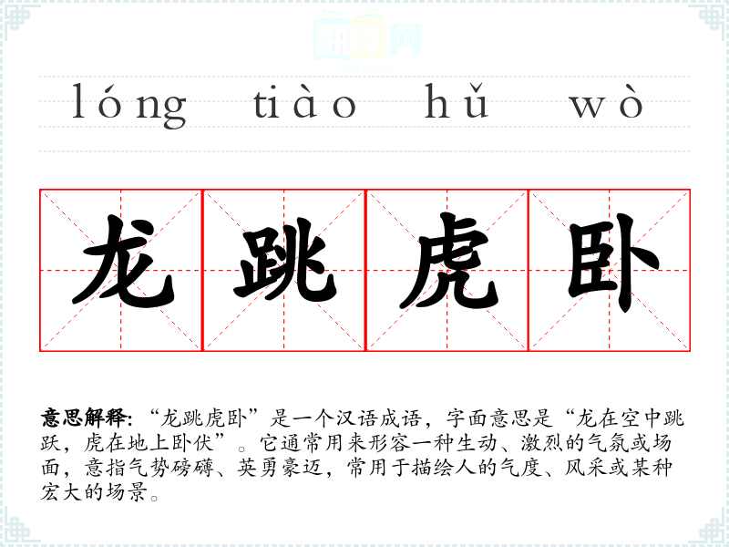 “龙跳虎卧”是一个汉语成语,字面意思是“龙在空中跳跃,虎在地上卧伏”。它通常用来形容一种生动、激烈的气氛或场面,意指气势磅礴、英勇豪迈,常用于描绘人的气度、风采或某种宏大的场景。