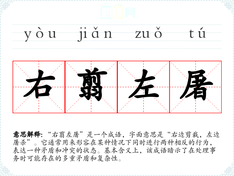 “右翦左屠”是一个成语,字面意思是“右边剪裁,左边屠杀”。它通常用来形容在某种情况下同时进行两种相反的行为,表达一种矛盾和冲突的状态。基本含义上,该成语暗示了在处理事务时可能存在的多重矛盾和复杂性。