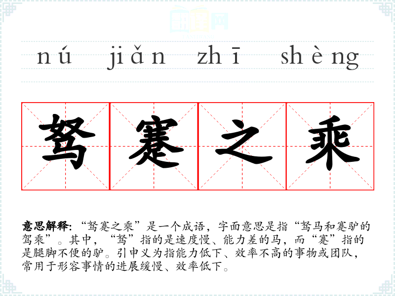 “驽蹇之乘”是一个成语,字面意思是指“驽马和蹇驴的驾乘”。其中,“驽”指的是速度慢、能力差的马,而“蹇”指的是腿脚不便的驴。引申义为指能力低下、效率不高的事物或团队,常用于形容事情的进展缓慢、效率低下。