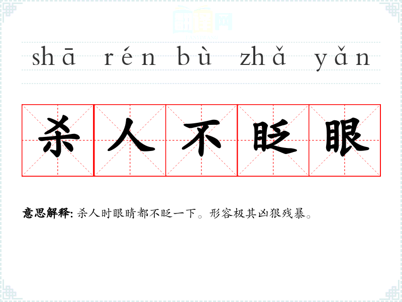 杀人时眼睛都不眨一下。形容极其凶狠残暴。 |