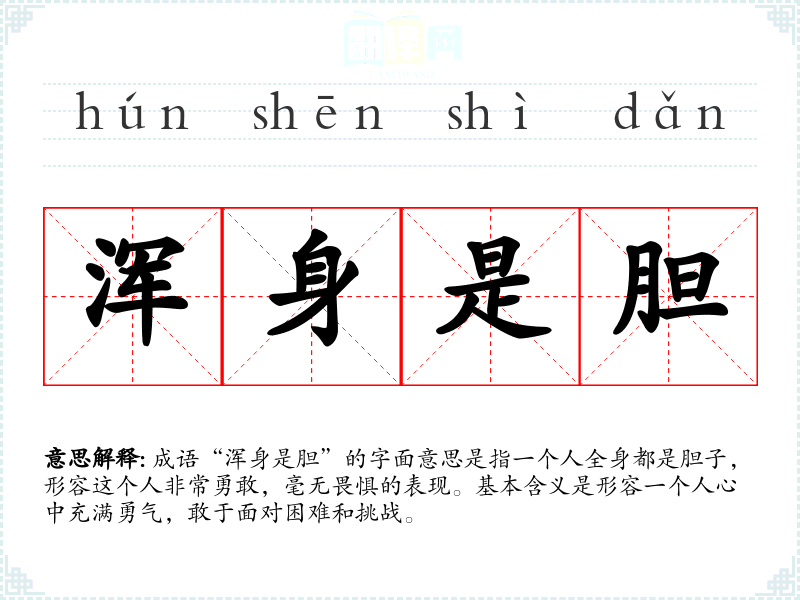 成语“浑身是胆”的字面意思是指一个人全身都是胆子,形容这个人非常勇敢,毫无畏惧的表现。基本含义是形容一个人心中充满勇气,敢于面对困难和挑战。