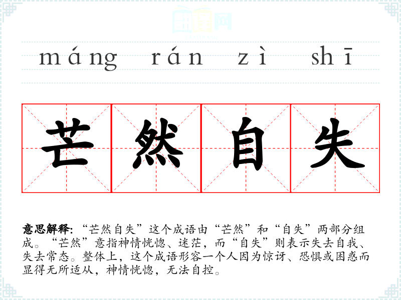 “芒然自失”这个成语由“芒然”和“自失”两部分组成。“芒然”意指神情恍惚、迷茫,而“自失”则表示失去自我、失去常态。整体上,这个成语形容一个人因为惊讶、恐惧或困惑而显得无所适从,神情恍惚,无法自控。