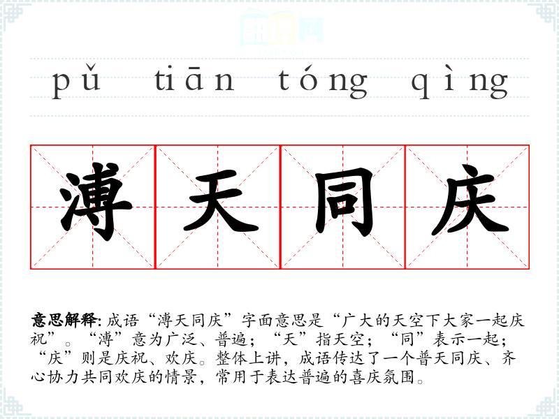 成语“溥天同庆”字面意思是“广大的天空下大家一起庆祝”。“溥”意为广泛、普遍;“天”指天空;“同”表示一起;“庆”则是庆祝、欢庆。整体上讲,成语传达了一个普天同庆、齐心协力共同欢庆的情景,常用于表达普遍的喜庆氛围。