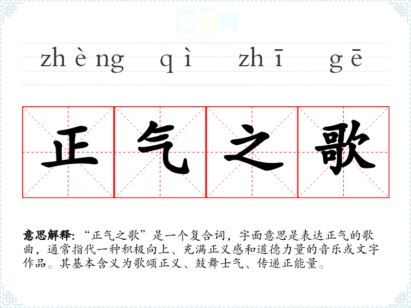 “正气之歌”是一个复合词,字面意思是表达正气的歌曲,通常指代一种积极向上、充满正义感和道德力量的音乐或文字作品。其基本含义为歌颂正义、鼓舞士气、传递正能量。