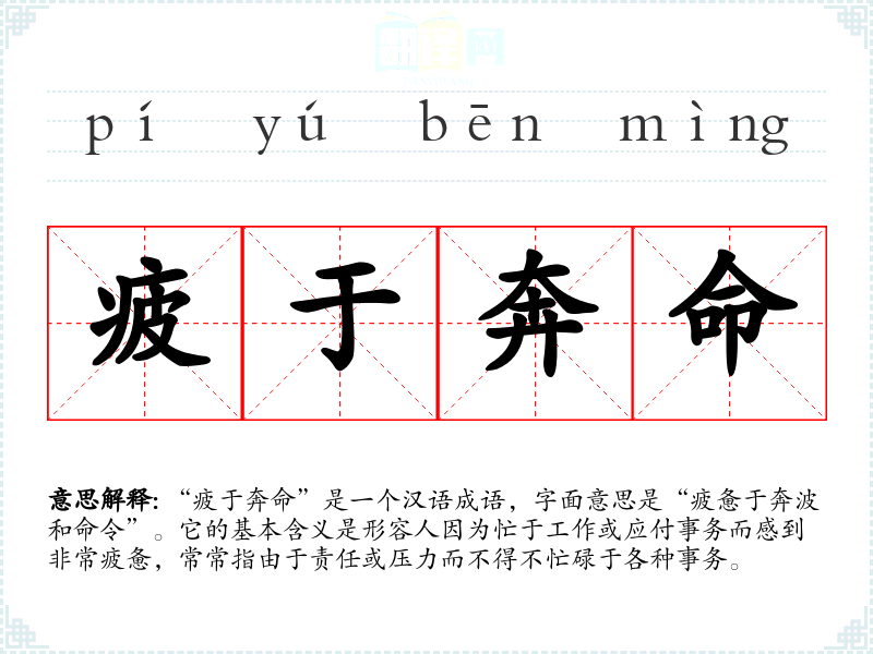 “疲于奔命”是一个汉语成语,字面意思是“疲惫于奔波和命令”。它的基本含义是形容人因为忙于工作或应付事务而感到非常疲惫,常常指由于责任或压力而不得不忙碌于各种事务。