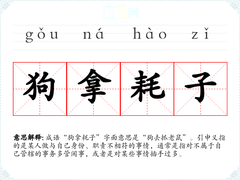 成语“狗拿耗子”字面意思是“狗去抓老鼠”。引申义指的是某人做与自己身份、职责不相符的事情,通常是指对不属于自己管辖的事务多管闲事,或者是对某些事情插手过多。
