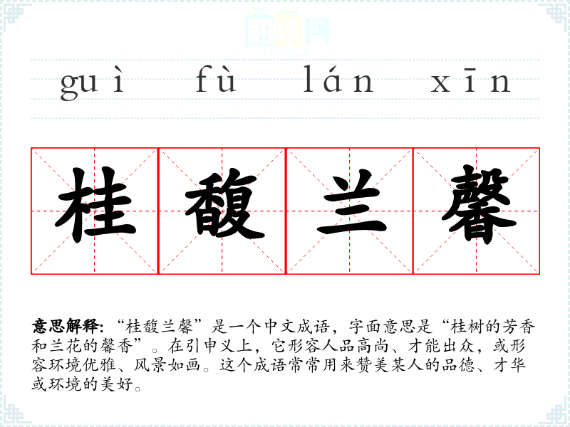 “桂馥兰馨”是一个中文成语,字面意思是“桂树的芳香和兰花的馨香”。在引申义上,它形容人品高尚、才能出众,或形容环境优雅、风景如画。这个成语常常用来赞美某人的品德、才华或环境的美好。