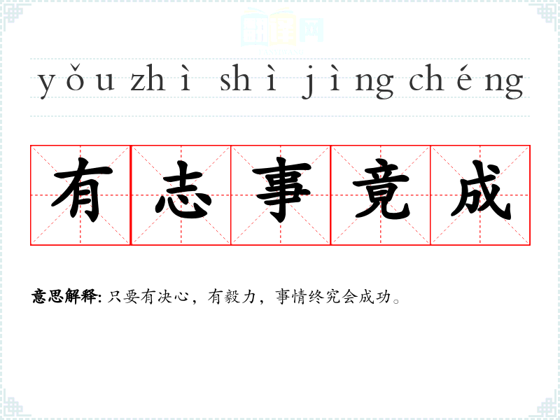 | 有志事竟成 | 只要有决心,有毅力,事情终究会成功。 |