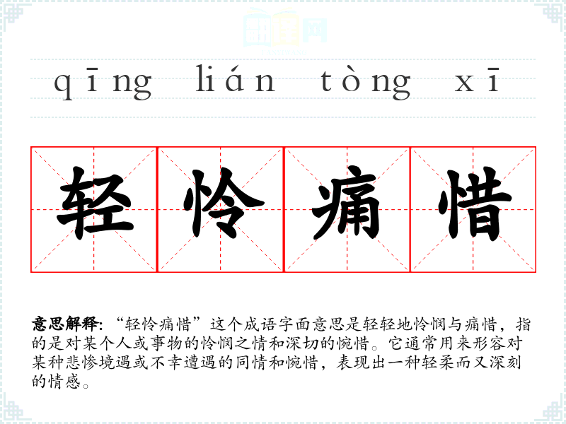 “轻怜痛惜”并没有明确的历史典故或文学出处,但其构成的词汇在**古代文学中常见,特别是与情感描写相关的诗词中。成语中“轻怜”与“痛惜”的结合,反映了古人对感情细腻的表达方式,显示出对事物的复杂看法。
