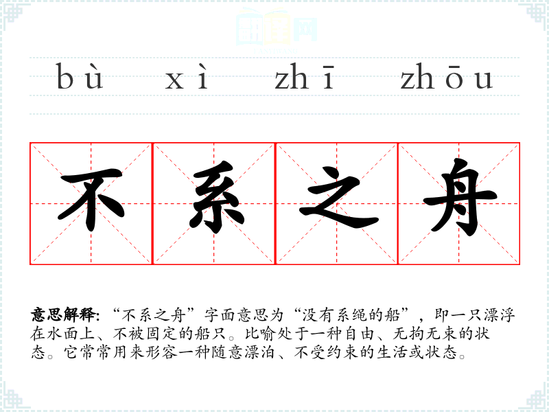 “不系之舟”字面意思为“没有系绳的船”,即一只漂浮在水面上、不被固定的船只。比喻处于一种自由、无拘无束的状态。它常常用来形容一种随意漂泊、不受约束的生活或状态。
