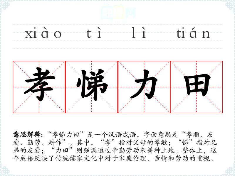 “孝悌力田”源自**古代的儒家思想,强调家庭伦理和社会责任。它强调孝顺父母和兄弟之间的和睦关系,以及通过勤劳工作来获得生计的美德。虽然没有确定的文学出处,但其内涵可以在《论语》等经典儒家著作中找到相关的思想基础。