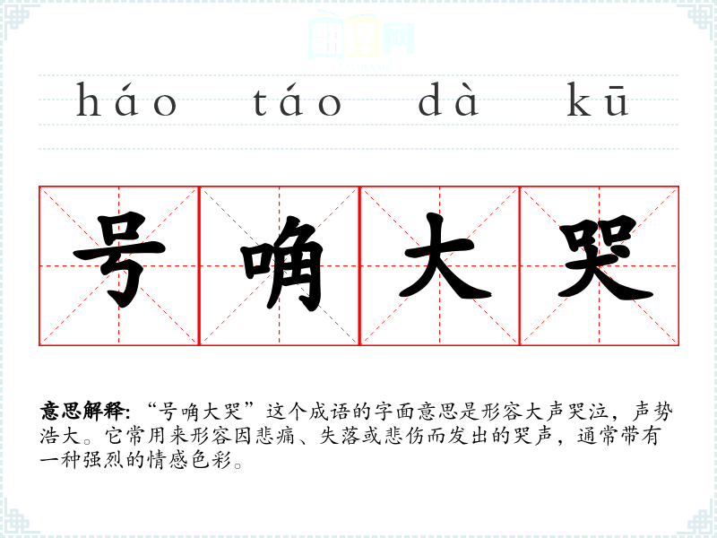 “号唃大哭”这个成语的字面意思是形容大声哭泣,声势浩大。它常用来形容因悲痛、失落或悲伤而发出的哭声,通常带有一种强烈的情感色彩。