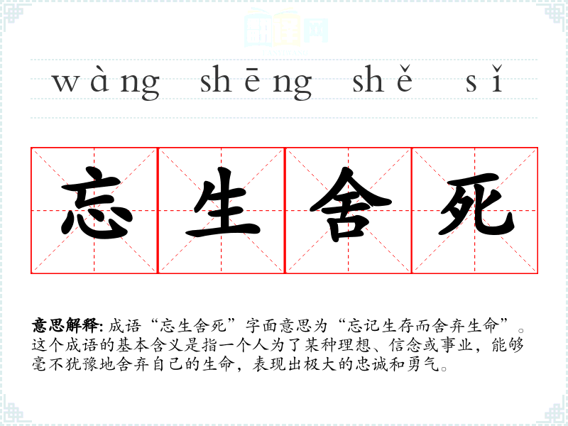 成语“忘生舍死”字面意思为“忘记生存而舍弃生命”。这个成语的基本含义是指一个人为了某种理想、信念或事业,能够毫不犹豫地舍弃自己的生命,表现出极大的忠诚和勇气。