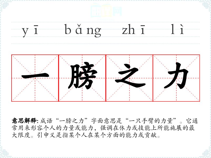 成语“一膀之力”字面意思是“一只手臂的力量”。它通常用来形容个人的力量或能力,强调在体力或技能上所能施展的最大限度。引申义是指某个人在某个方面的能力或贡献。