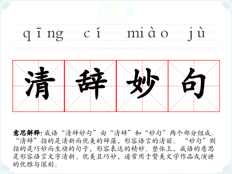 成语“清辞妙句”由“清辞”和“妙句”两个部分组成。“清辞”指的是清新而优美的辞藻,形容语言的清丽。 “妙句”则指的是巧妙而生动的句子,形容表达的精妙。整体上,成语的意思是形容语言文字清新、优美且巧妙,通常用于赞美文学作品或演讲的优雅与深刻。