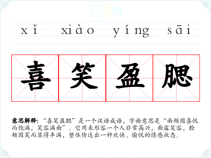 “喜笑盈腮”是一个汉语成语,字面意思是“面颊因喜悦而饱满,笑容满面”。它用来形容一个人非常高兴,面露笑容,脸颊因笑而显得丰满,整体传达出一种欢快、愉悦的情感状态。