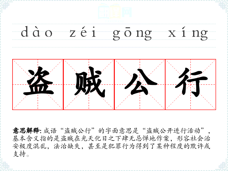 成语“盗贼公行”的字面意思是“盗贼公开进行活动”,基本含义指的是盗贼在光天化日之下肆无忌惮地作案,形容社会治安极度混乱,法治缺失,甚至是犯罪行为得到了某种程度的默许或支持。