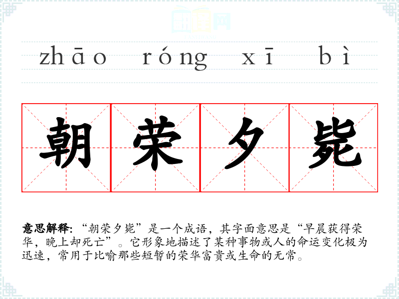 “朝荣夕毙”是一个成语,其字面意思是“早晨获得荣华,晚上却死亡”。它形象地描述了某种事物或人的命运变化极为迅速,常用于比喻那些短暂的荣华富贵或生命的无常。